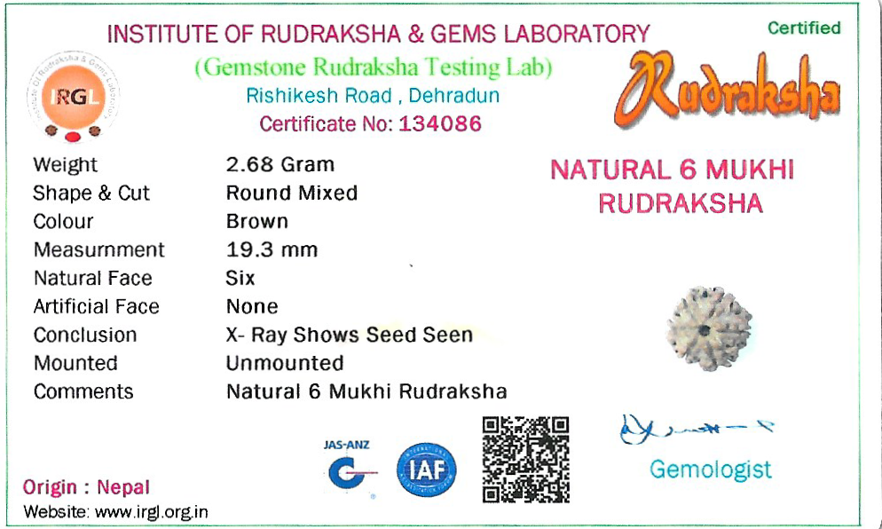 Natural 6 Mukhi Rudraksha weighing 1 piece