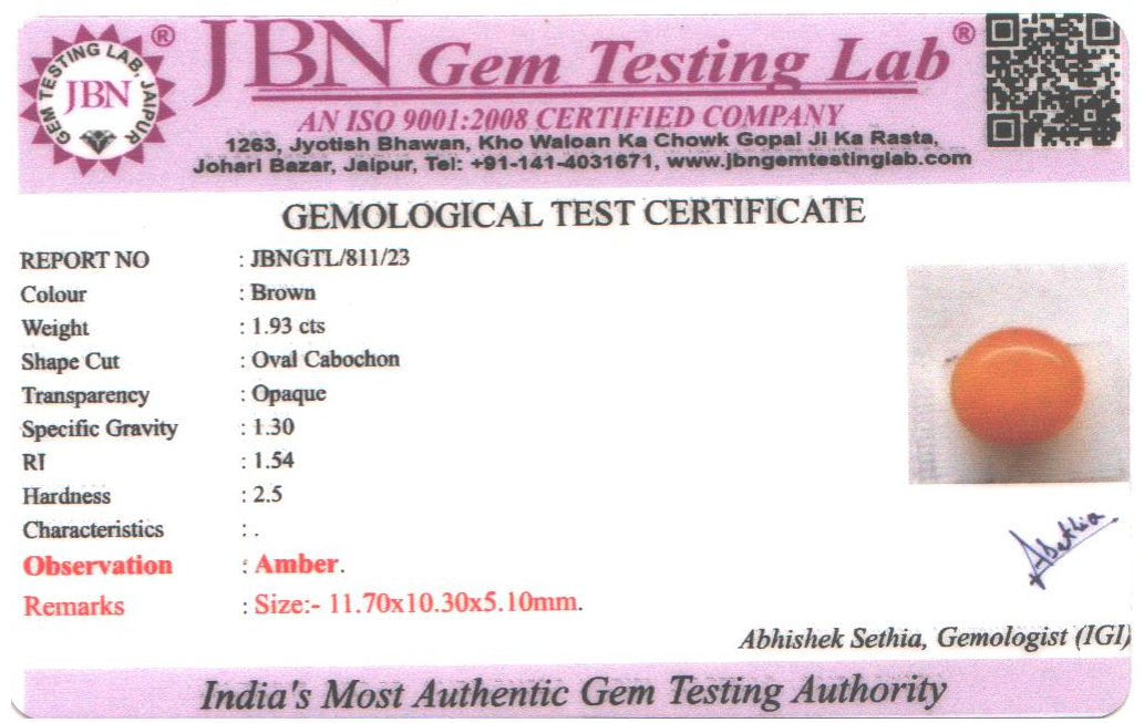 Natural Amber weighing 1.93 carats In Oval
