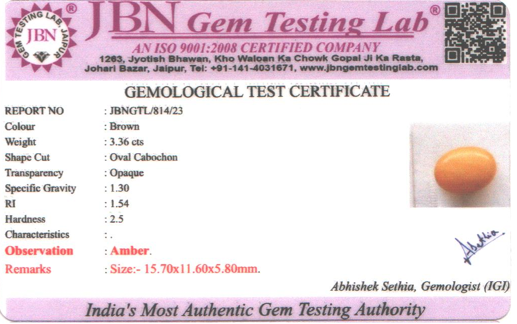 Natural Amber weighing 3.36 carats In Oval