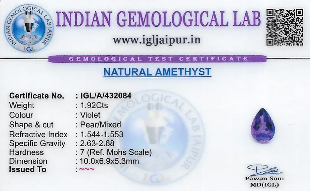Natural Amethyst weighing 1.92 carats In Pear from Brazil