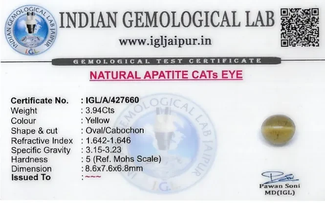 Natural Apatite Cat's Eye weighing 3.94 carats In Oval