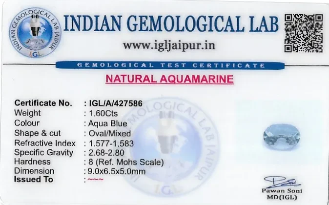 Natural Aquamarine weighing 1.6 carats In Oval