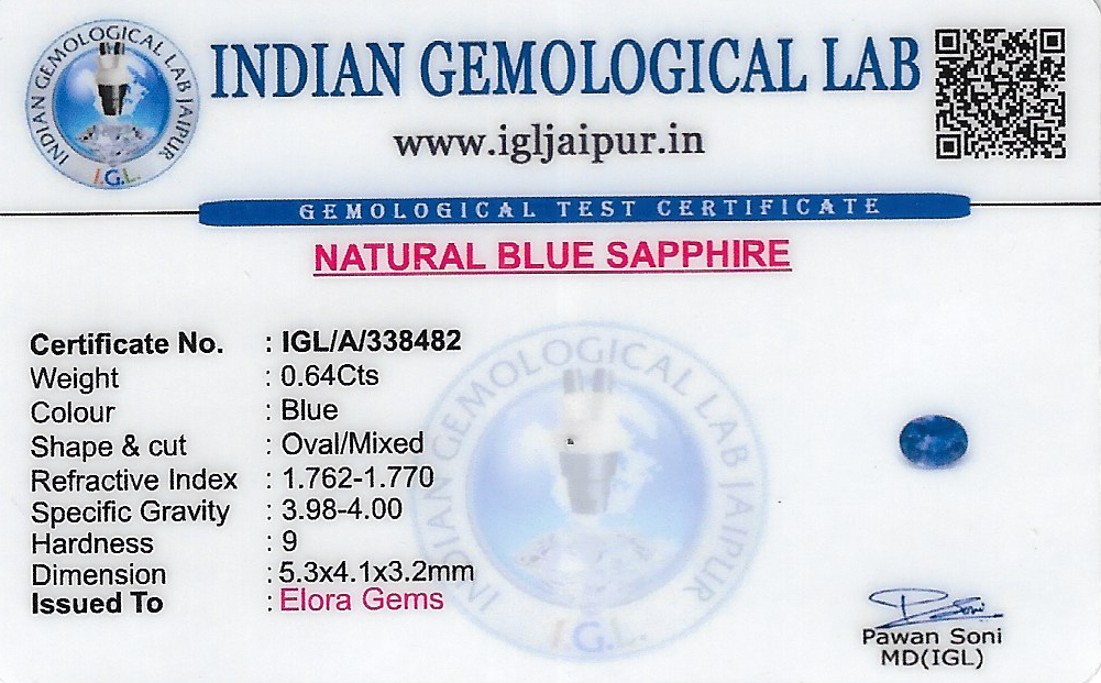Natural Blue Sapphire (Neelam) weighing 0.64 carats In Oval from Thailand