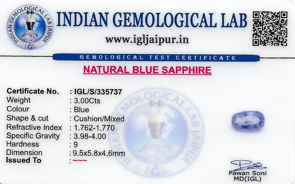 Natural Blue Sapphire (Neelam) weighing 3 carats In Cushion from Sri Lanka (Ceylon)