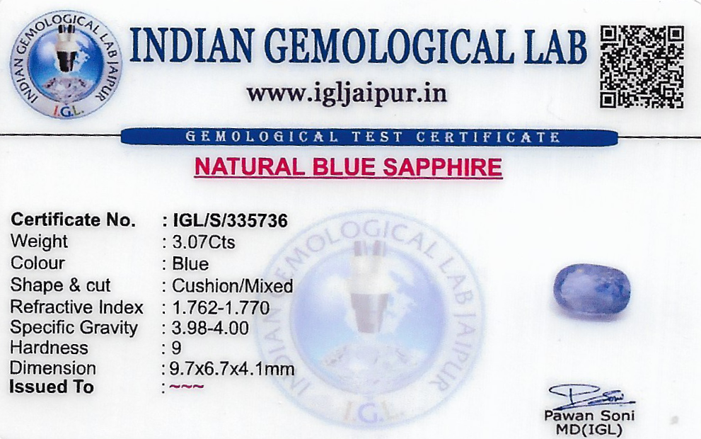Natural Blue Sapphire (Neelam) weighing 3.07 carats In Cushion from Sri Lanka (Ceylon)