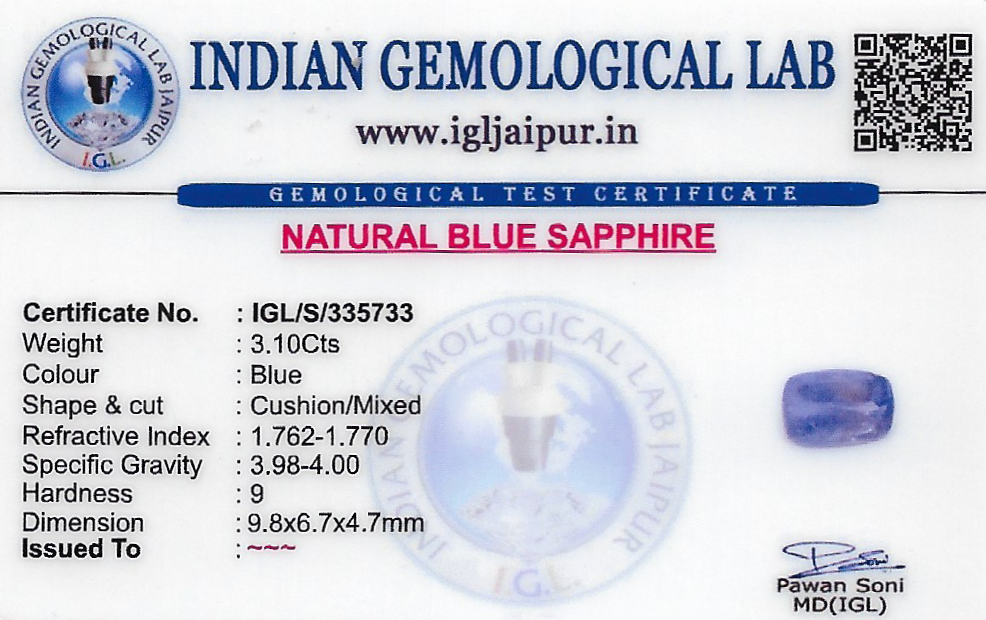 Natural Blue Sapphire (Neelam) weighing 3.1 carats In Cushion from Sri Lanka (Ceylon)