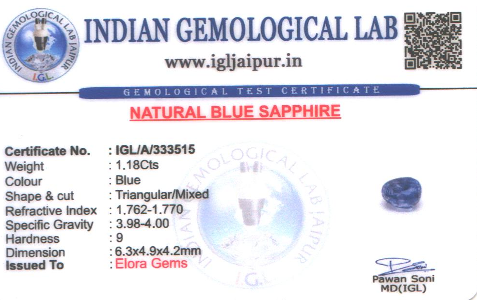 Natural Blue Sapphire (Neelam) weighing 1.18 carats In Triangular from Sri Lanka (Ceylon)