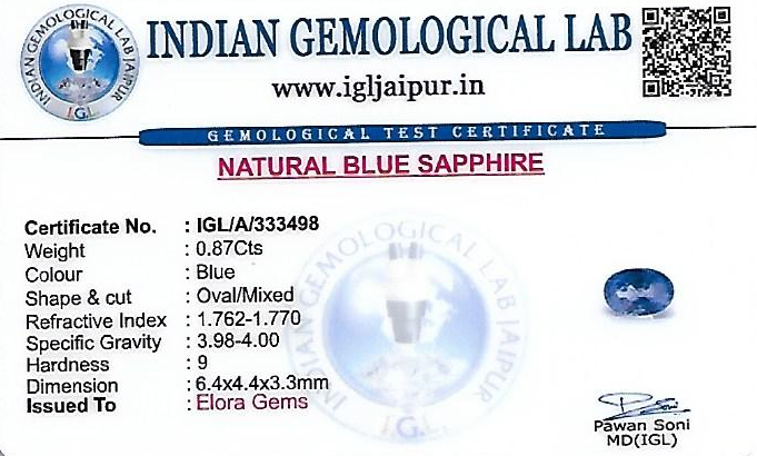Natural Blue Sapphire (Neelam) weighing 0.87 carats In Oval from Sri Lanka (Ceylon)