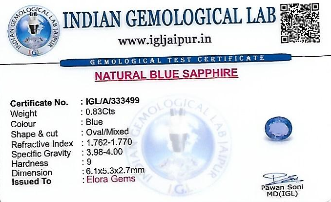 Natural Blue Sapphire (Neelam) weighing 0.83 carats In Oval from Sri Lanka (Ceylon)