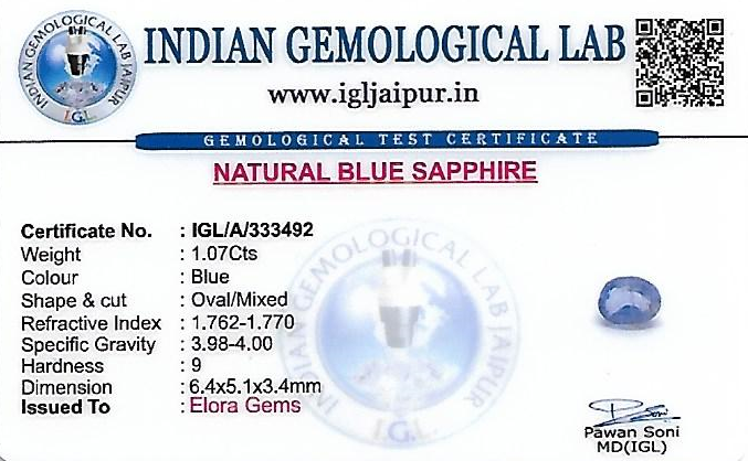 Natural Blue Sapphire (Neelam) weighing 1.07 carats In Oval from Sri Lanka (Ceylon)