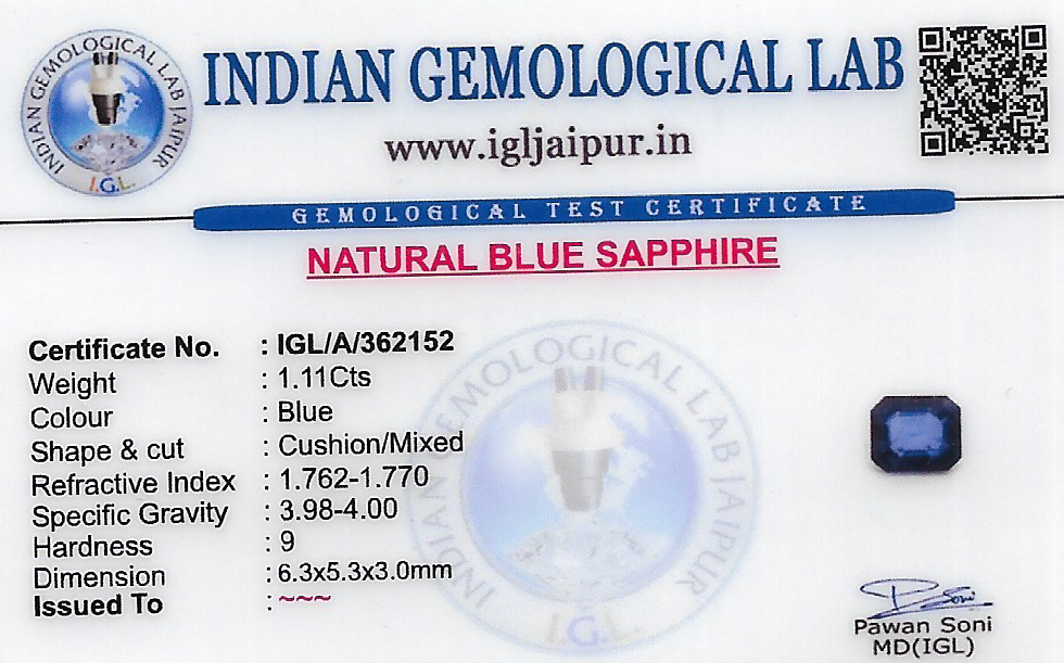 Natural Blue Sapphire (Neelam) weighing 1.11 carats In Cushion from Thailand