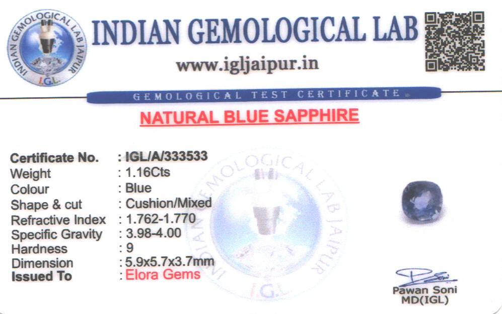 Natural Blue Sapphire (Neelam) weighing 1.16 carats In Cushion from Sri Lanka (Ceylon)