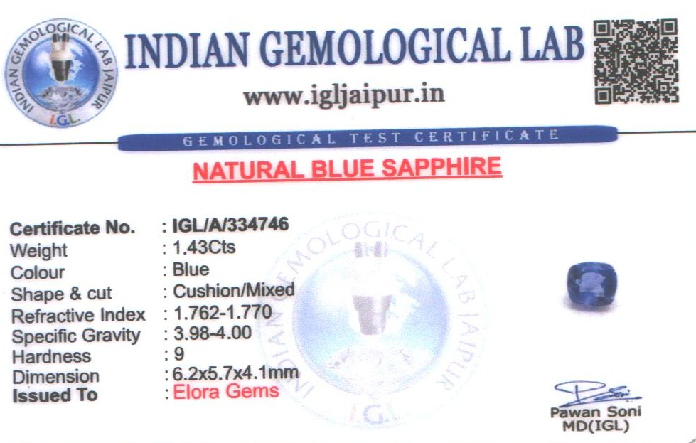 Natural Blue Sapphire (Neelam) weighing 1.43 carats In Cushion from Sri Lanka (Ceylon)