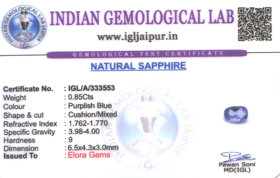 Natural Blue Sapphire (Neelam) weighing 0.85 carats In Cushion from Sri Lanka (Ceylon)