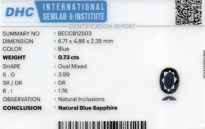 Natural Blue Sapphire (Neelam) weighing 0.73 carats In Oval from Thailand
