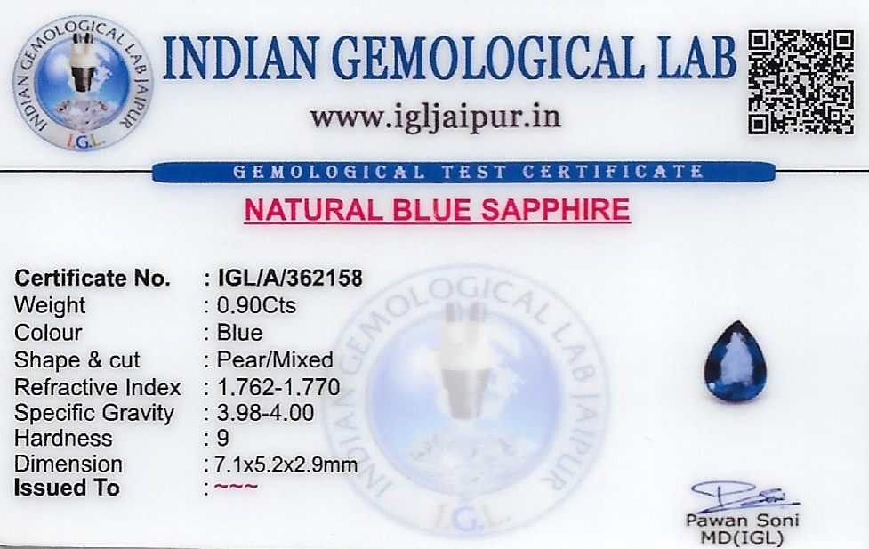 Natural Blue Sapphire (Neelam) weighing 0.9 carats In Pear from Thailand