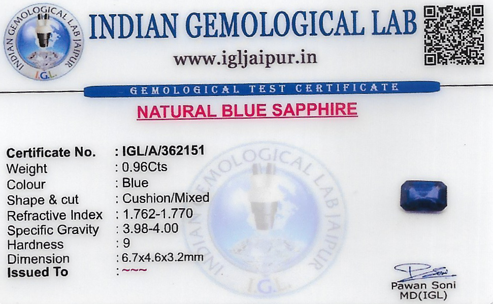 Natural Blue Sapphire (Neelam) weighing 0.96 carats In Cushion from Thailand