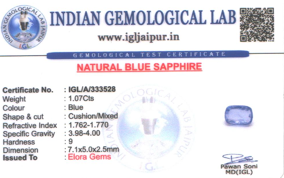 Natural Blue Sapphire (Neelam) weighing 1.07 carats In Cushion from Sri Lanka (Ceylon)
