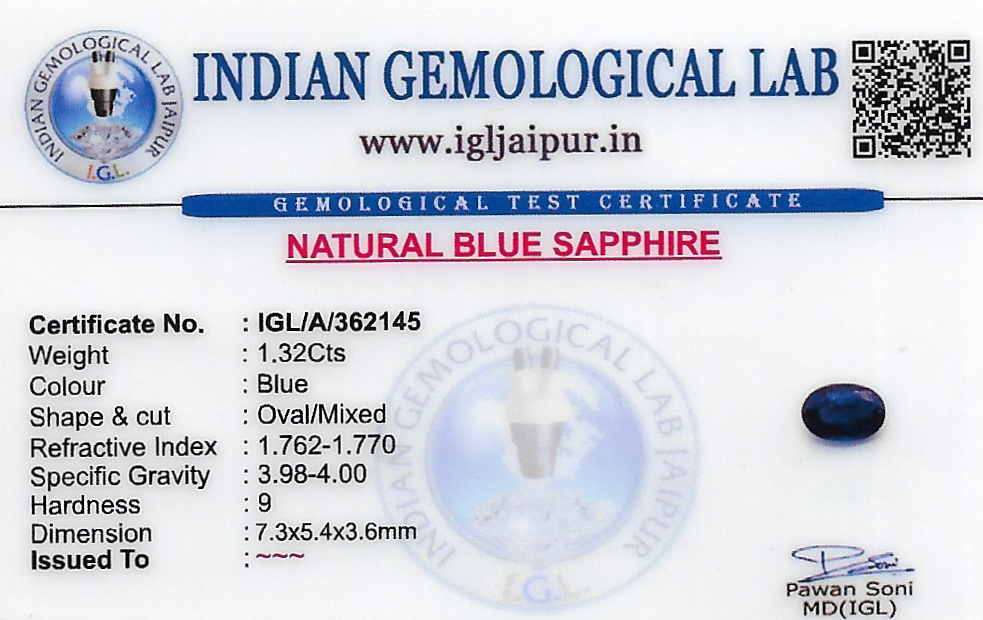 Natural Blue Sapphire (Neelam) weighing 1.32 carats In Oval from Thailand