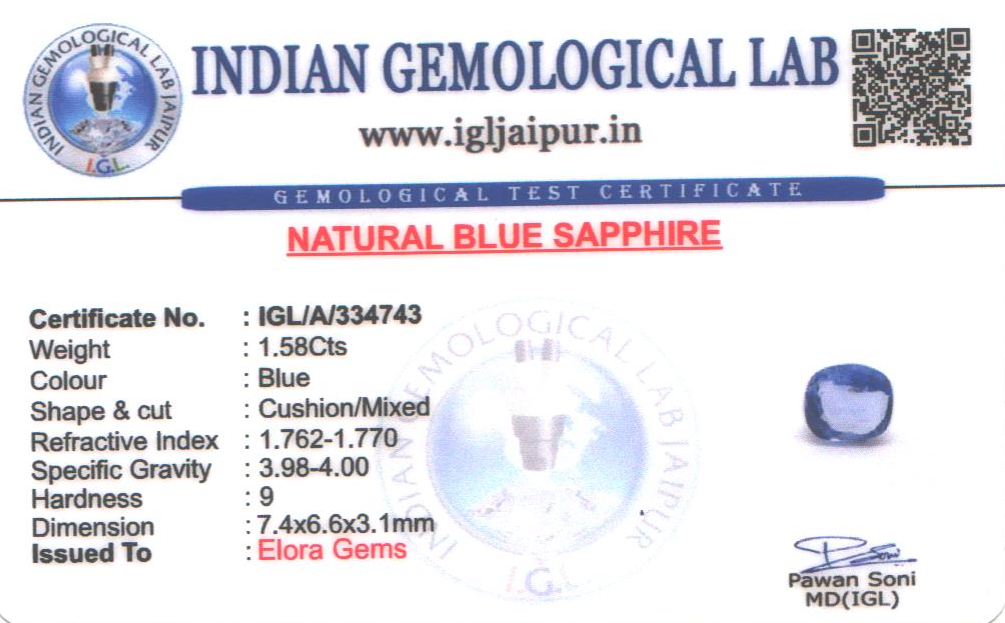 Natural Blue Sapphire (Neelam) weighing 1.58 carats In Cushion from Sri Lanka (Ceylon)
