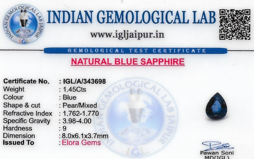 Natural Blue Sapphire (Neelam) weighing 1.45 carats In Pear from Thailand