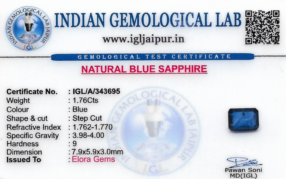Natural Blue Sapphire (Neelam) weighing 1.76 carats from Thailand