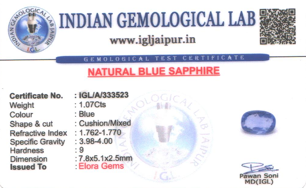 Natural Blue Sapphire (Neelam) weighing 1.07 carats In Cushion from Sri Lanka (Ceylon)
