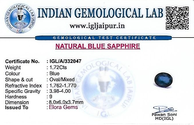 Natural Blue Sapphire (Neelam) weighing 1.72 carats In Oval from Thailand