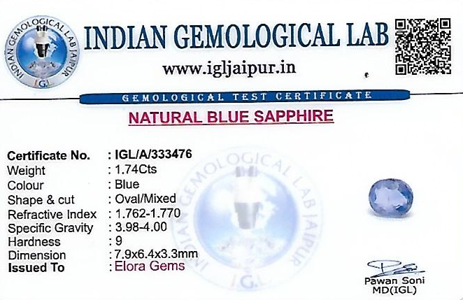 Natural Blue Sapphire (Neelam) weighing 1.74 carats In Oval from Sri Lanka (Ceylon)