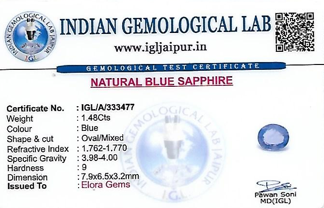 Natural Blue Sapphire (Neelam) weighing 1.48 carats In Oval from Sri Lanka (Ceylon)