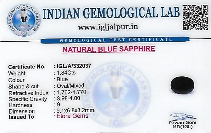 Natural Blue Sapphire (Neelam) weighing 1.84 carats In Oval from Thailand