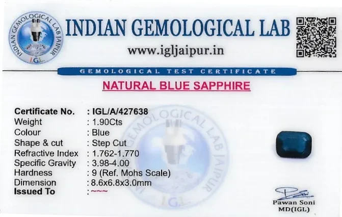 Natural Blue Sapphire (Neelam) weighing 1.9 carats In Rectangle from Thailand