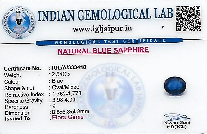 Natural Blue Sapphire (Neelam) weighing 2.54 carats In Oval from Thailand