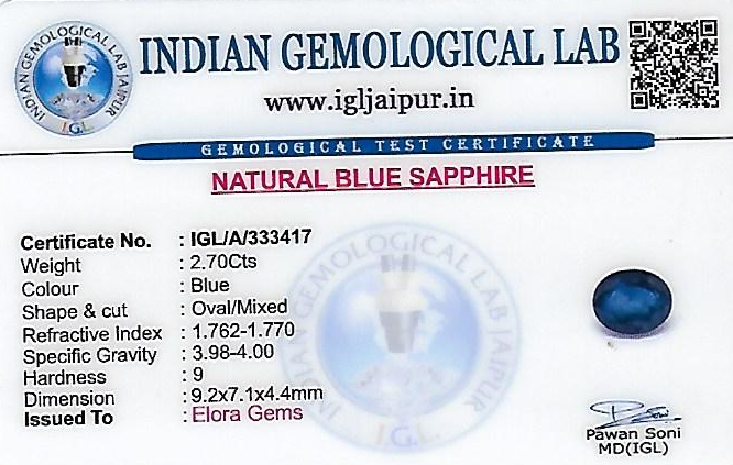 Natural Blue Sapphire (Neelam) weighing 2.7 carats In Oval from Thailand