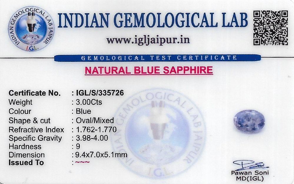 Natural Blue Sapphire (Neelam) weighing 3 carats In Oval from Sri Lanka (Ceylon)