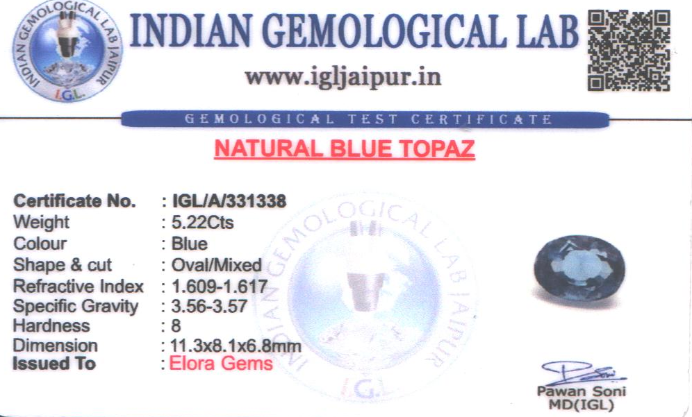 Natural Blue Topaz weighing 5.22 carats In Oval