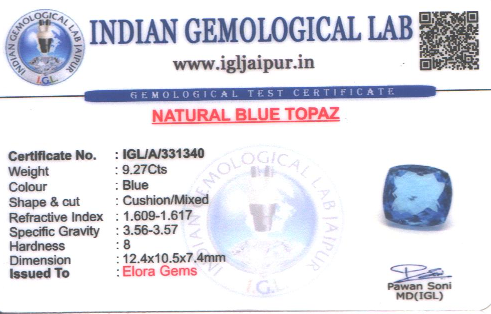 Natural Blue Topaz weighing 9.27 carats In Cushion