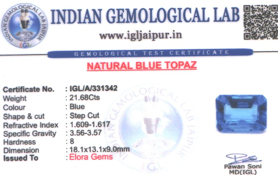 Natural Blue Topaz weighing 21.68 carats In Rectangle