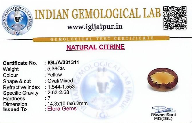 Natural Citrine weighing 5.36 carats In Oval