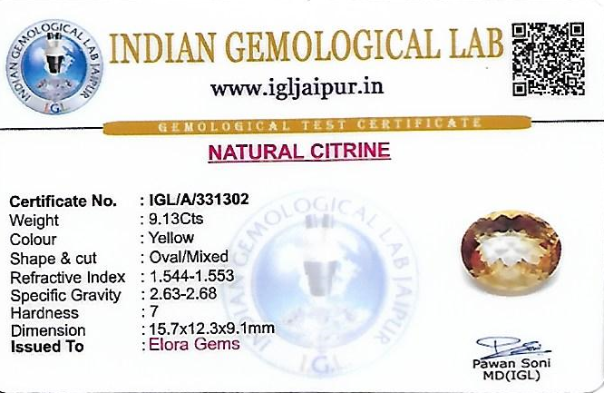 Natural Citrine weighing 9.13 carats In Oval