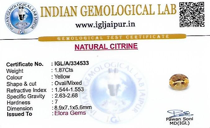 Natural Citrine weighing 1.87 carats In Oval