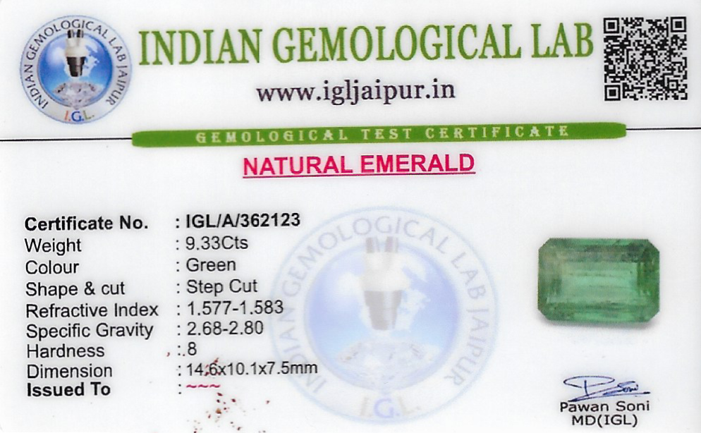 Natural Emerald (Maragadham) weighing 9.33 carats from Zambia
