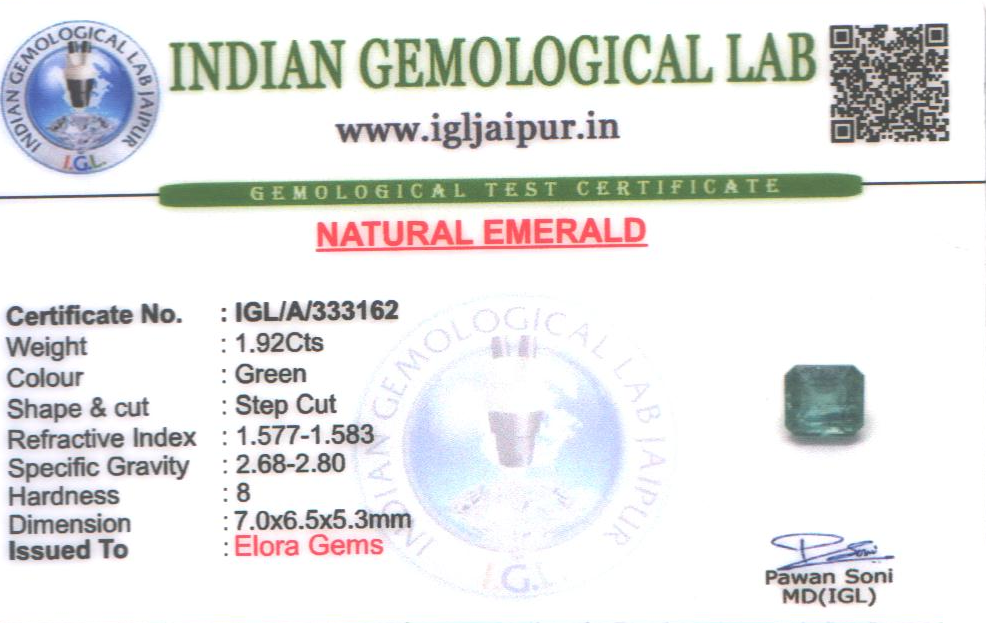Natural Emerald (Maragadham) weighing 1.92 carats from Zambia