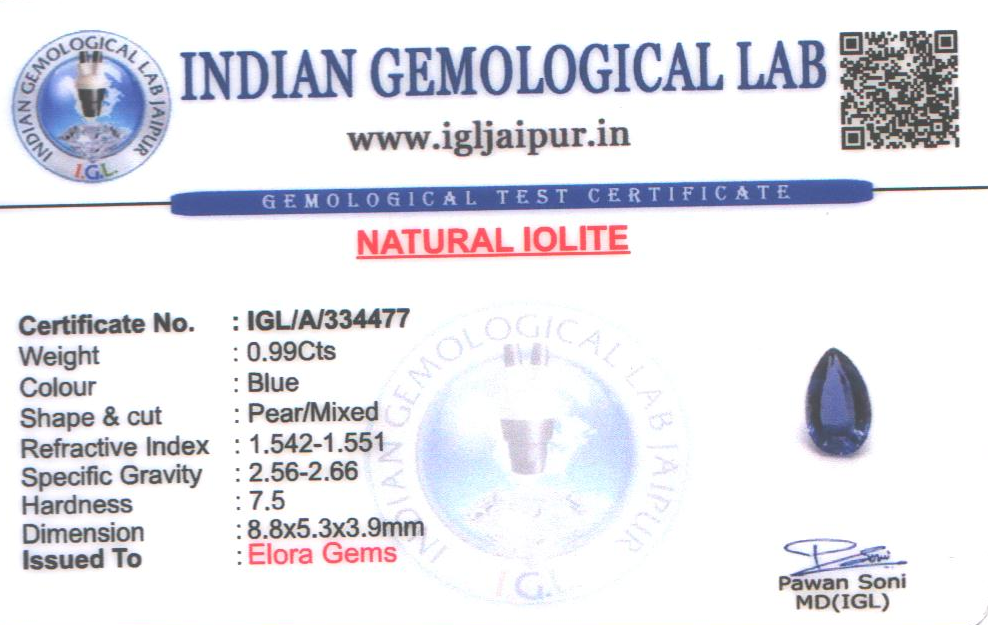 Natural Iolite weighing 0.99 carats In Pear