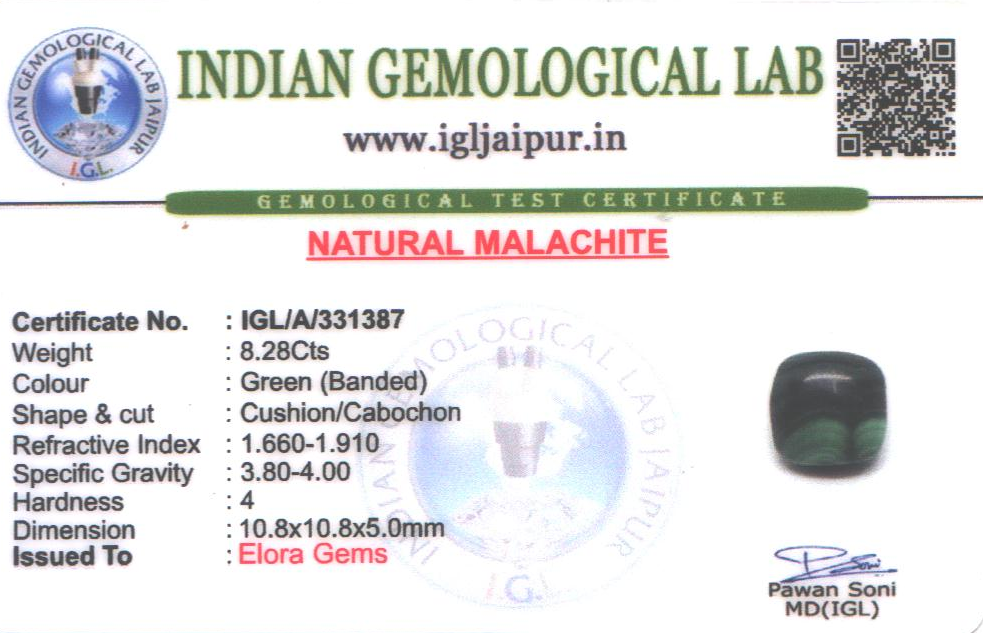 Natural Malachite weighing 8.28 carats In Cushion