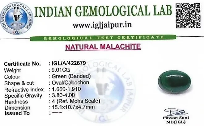 Natural Malachite weighing 9.01 carats In Oval