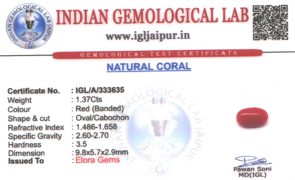 Natural Red Coral (Pavalam) weighing 1.37 carats In Oval from Japan