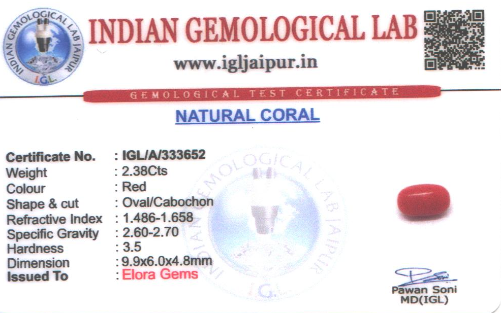 Natural Red Coral (Pavalam) weighing 2.38 carats In Oval from Italy
