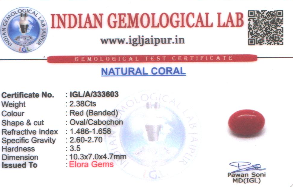 Natural Red Coral (Pavalam) weighing 2.38 carats In Oval from Japan
