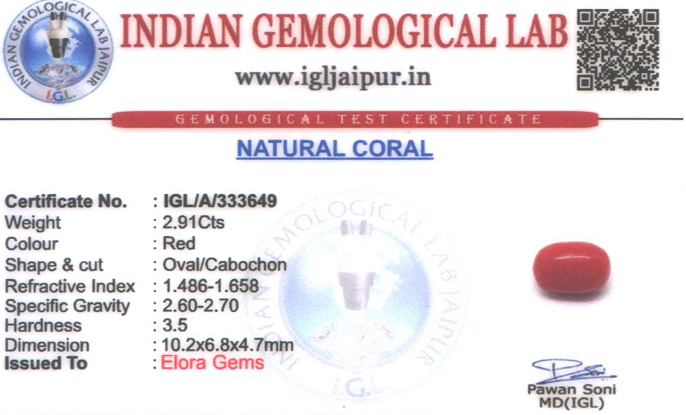 Natural Red Coral (Pavalam) weighing 2.91 carats In Oval from Italy